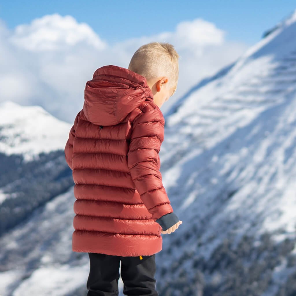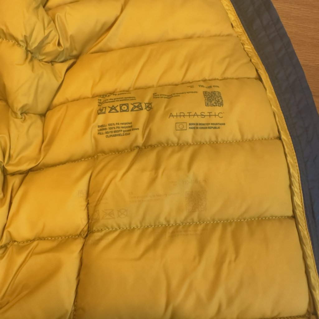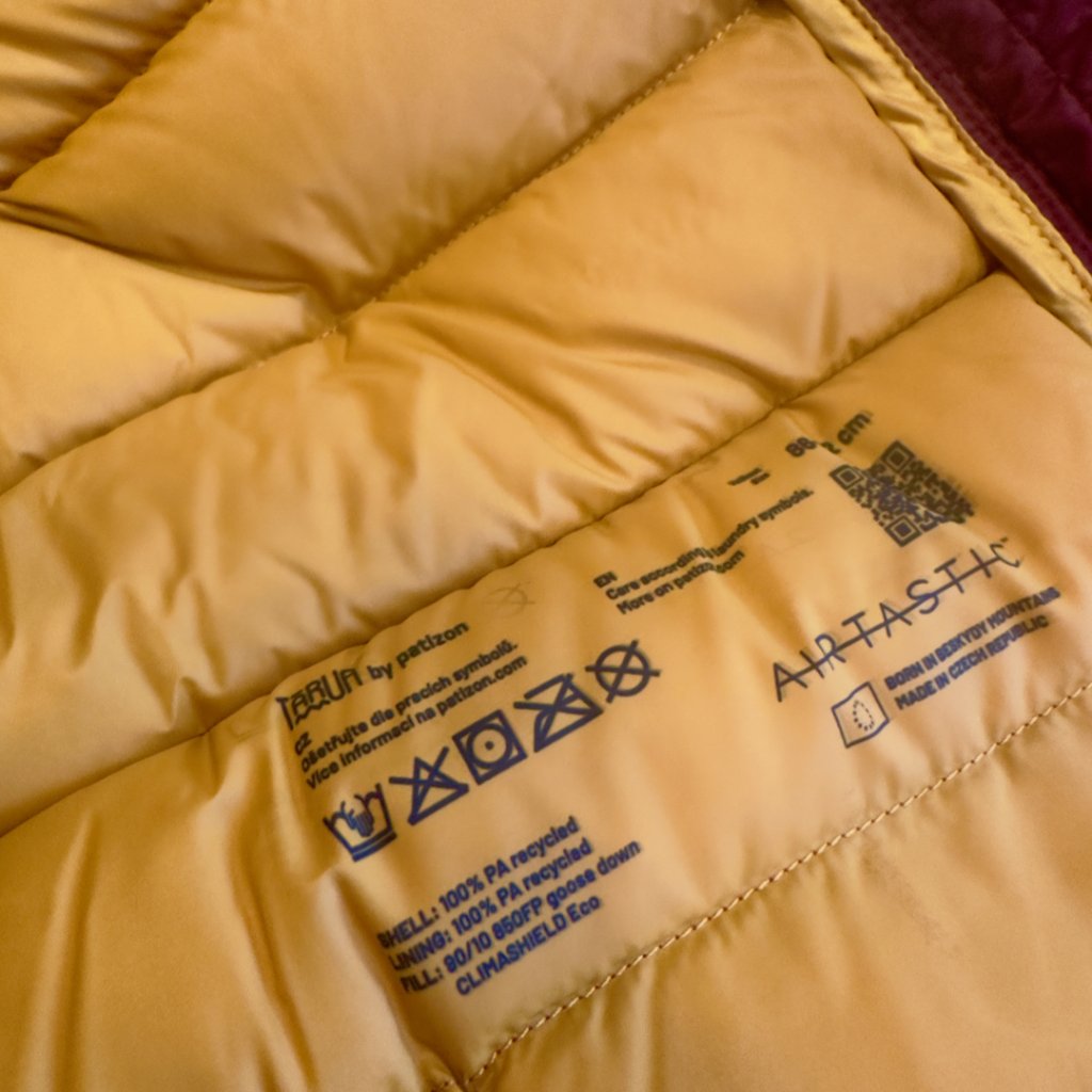 Dětská péřová bunda je ušitá ze 100% recyklovaného nylonu Toray™ Airtastic™ ošetřeného ekologickou DWR úpravou pro odpuzování vody. Ultralehký materiál, který vznikl znovuzpracováním zbytkové metráže. Kombinuje vysokou prodyšnost a jemnost se slušnou odolností a zvládne i lehkou přeháňku.